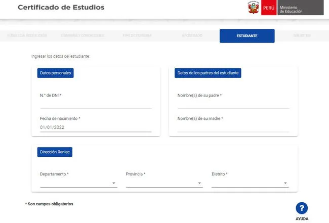 Tras terminar la solicitud del certificado de estudios deberán especificar quién es la persona que realiza el trámite. Asimismo, se deberá ingresar los datos del alumno, DNI, fecha de nacimiento, nombre de los padres y dirección. Al finalizar dicho paso aparecerán los datos académicos del estudiante, siendo necesario colocar el celular y correo.