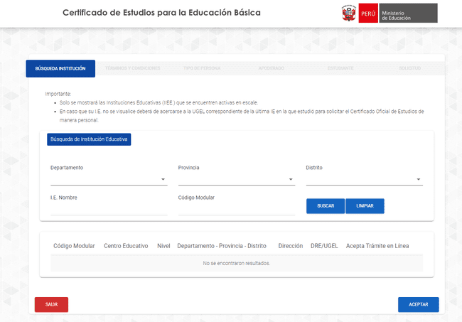Paso 3: la nueva ventana corresponde a la búsqueda de la institución, donde se requerirá llenar los datos correspondientes en torno al departamento, provincia, distrito, I.E Nombre y código Modular. Al culminar el proceso, solo deberán presionar en «Aceptar». Para ingresar directamente, ingresen AQUÍ.