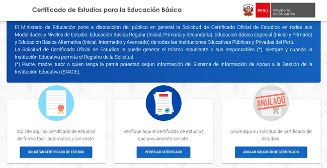Los peruanos interesados en acceder al certificado de estudios podrán gestionar la documentación desde cualquier dispositivo, siendo necesaria la información básica del alumno y el colegio. En la misma línea, deberán tener en cuenta las condiciones, requisitos y el proceso correspondiente a través del aplicativo.