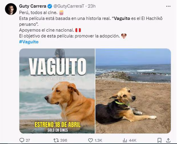 “@GutyCarreraT. Perú, todos al cine (…) Esta película está basada en una historia real. “Vaguito es ‘El Hachiko peruano” (…) Apoyemos el cine nacional (…) El objetivo de esta película: promover la adopción.”, escribió en su cuenta.