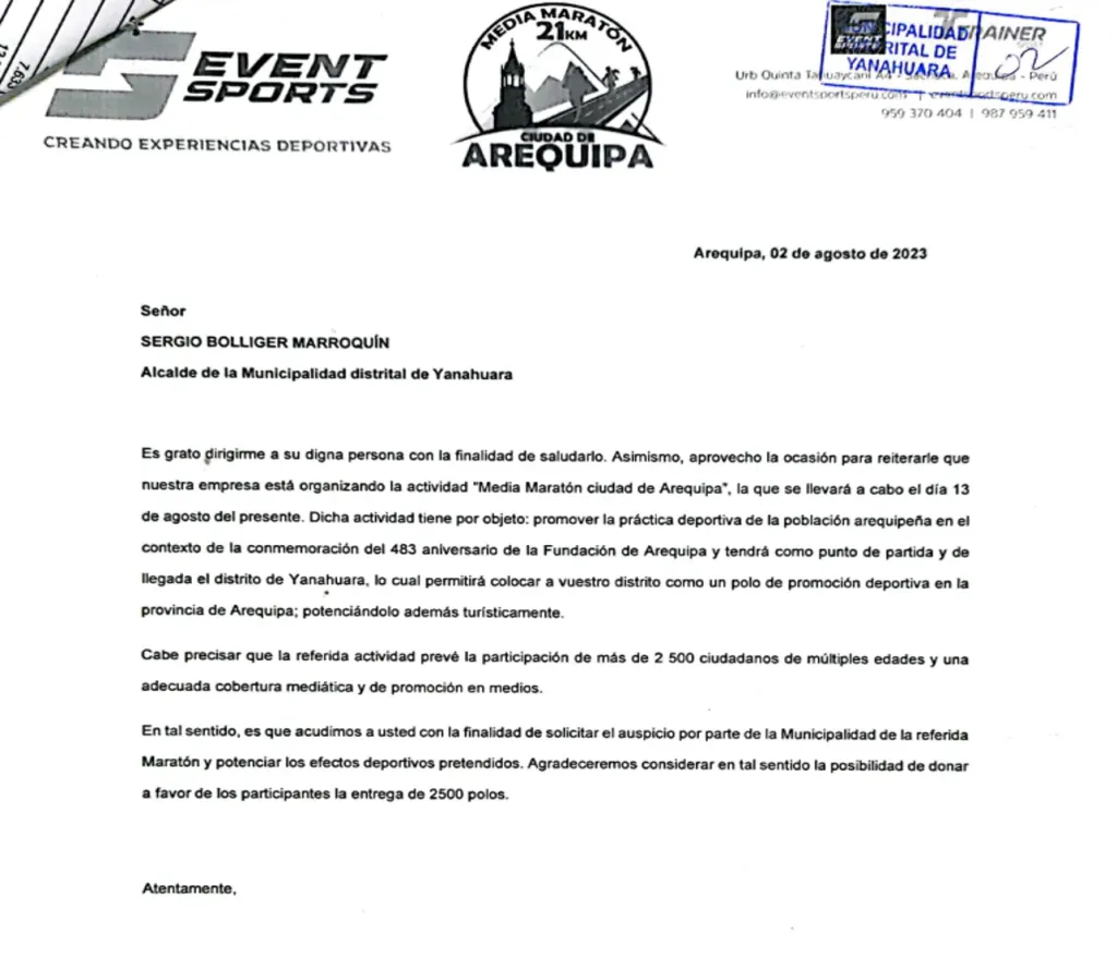 La bomba estalló luego de descubrirse que el municipio aprobó a la carrera la donación de 2 mil polos valorizados en S/ 25,800 para una media maratón organizada por la cuestionada empresa. Lo que huele mal es que se trataba de un evento privado con fines de lucro, ya que los participantes pagaron inscripción pese a que la comuna ya había soltado el billete en auspicios. El trámite del expediente también levanta cejas: se ingresó fuera de horario y, de manera sospechosa, en menos de una hora fue aprobado por tres oficinas municipales.